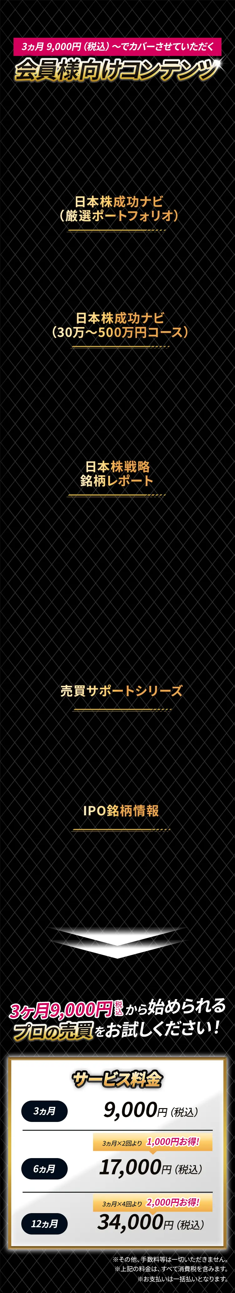 販売価格 日本株基本会員(3ヶ月9,000円(税込み)、6ヶ月17,000円(税込み)、1年34,000円(税込み)。中国株基本会員 (3ヶ月9,000円(税込み)、6ヶ月17,000円(税込み)、1年34,000円(税込み)。シルバー会員コース(プレミアムサービス)2年以上基本会員を続け、かつ一定の条件をクリアした会員だけが購入し活用出来るサービス。コンテンツによって価格は異なります。
