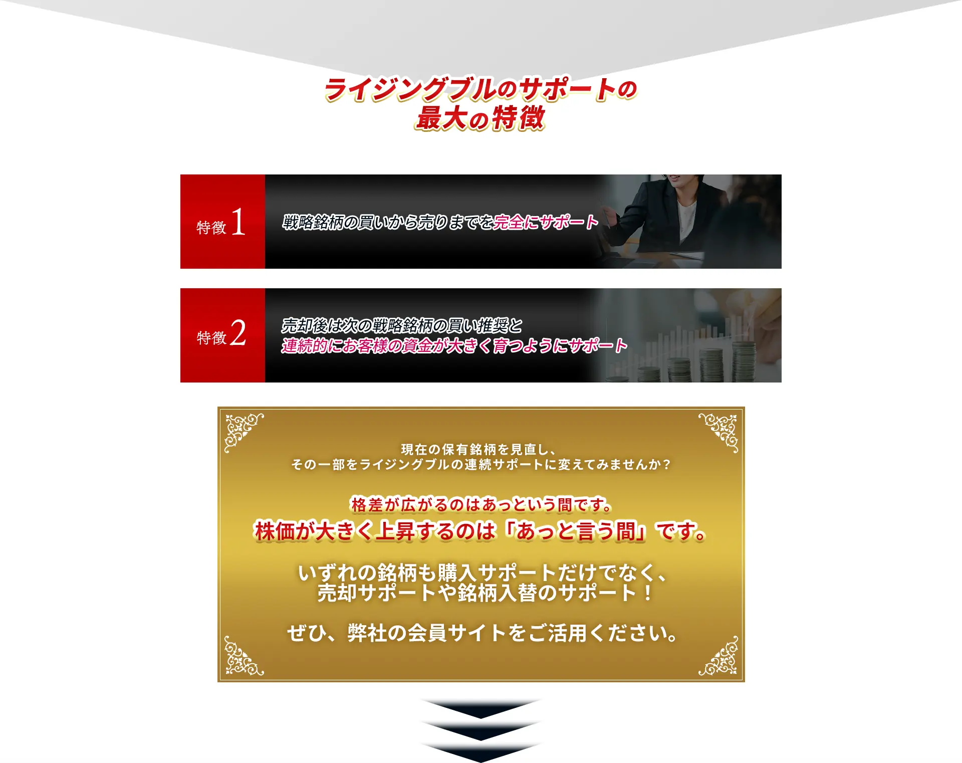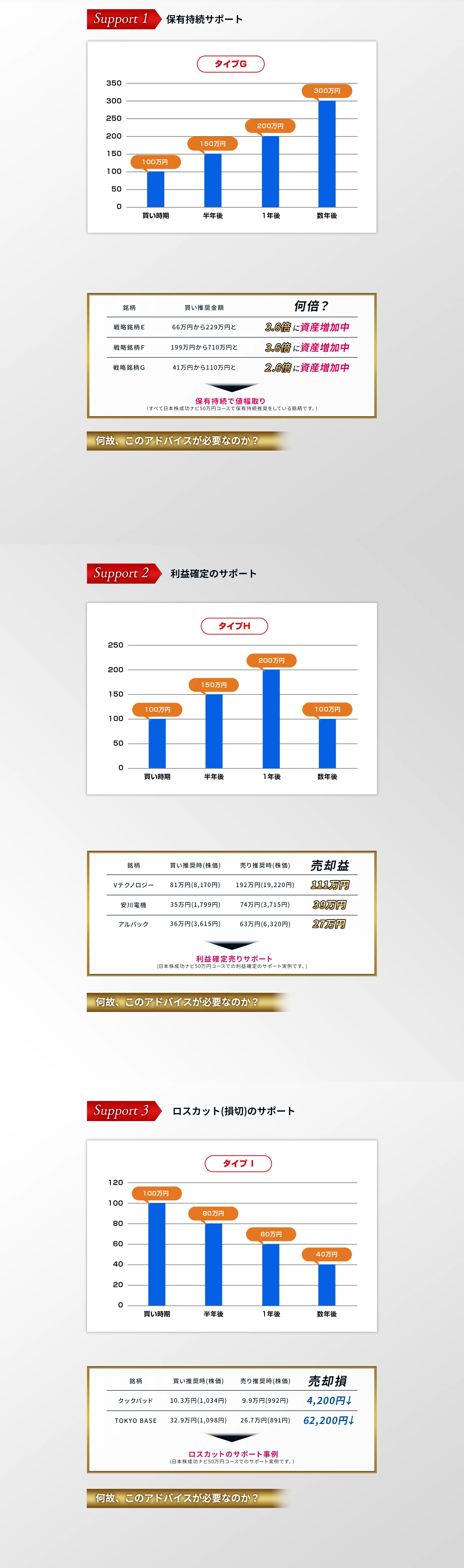 株式投資を成功させ、お金を増やすには、1回の情報提供だけでなく、いろんな変化に合わせた株の売り買いのサポートが何よりも重要です。弊社ではお客様に株で財産を築いていただくために買うべき株、売るべき株、その後に買うべき株と一環したサポートを行っています。