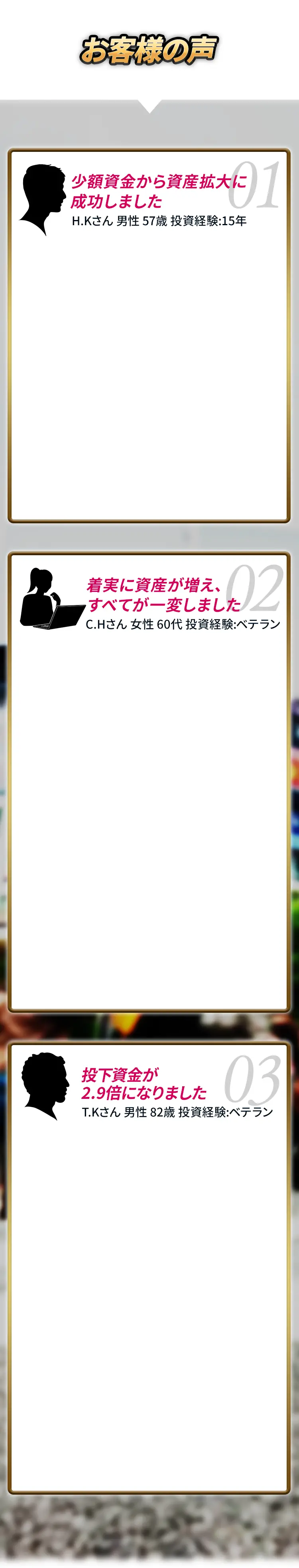 株式投資歴15年。しかし素人では無理!と今でも痛感しています。独学の知識と証券会社の活用では、損失の繰り返しでした。思いついたのはプロの頭を借りる事。投資顧問会社2社を利用しました。しかしどこも資産を増やす事が出来ない。これでは意味がない。株はプロでも無理か?と思っていた中、たどり着いたのがライジングブル投資顧問でした。少額資金から運用を始め、その結果から運用額を増やし資産拡大に成功しました。もちろんお付き合いしてからライジングブルでの大きな損失はありません。組む相手でこんなに変わるものか。今では数百万が数千万にもなり本当に感謝しております。