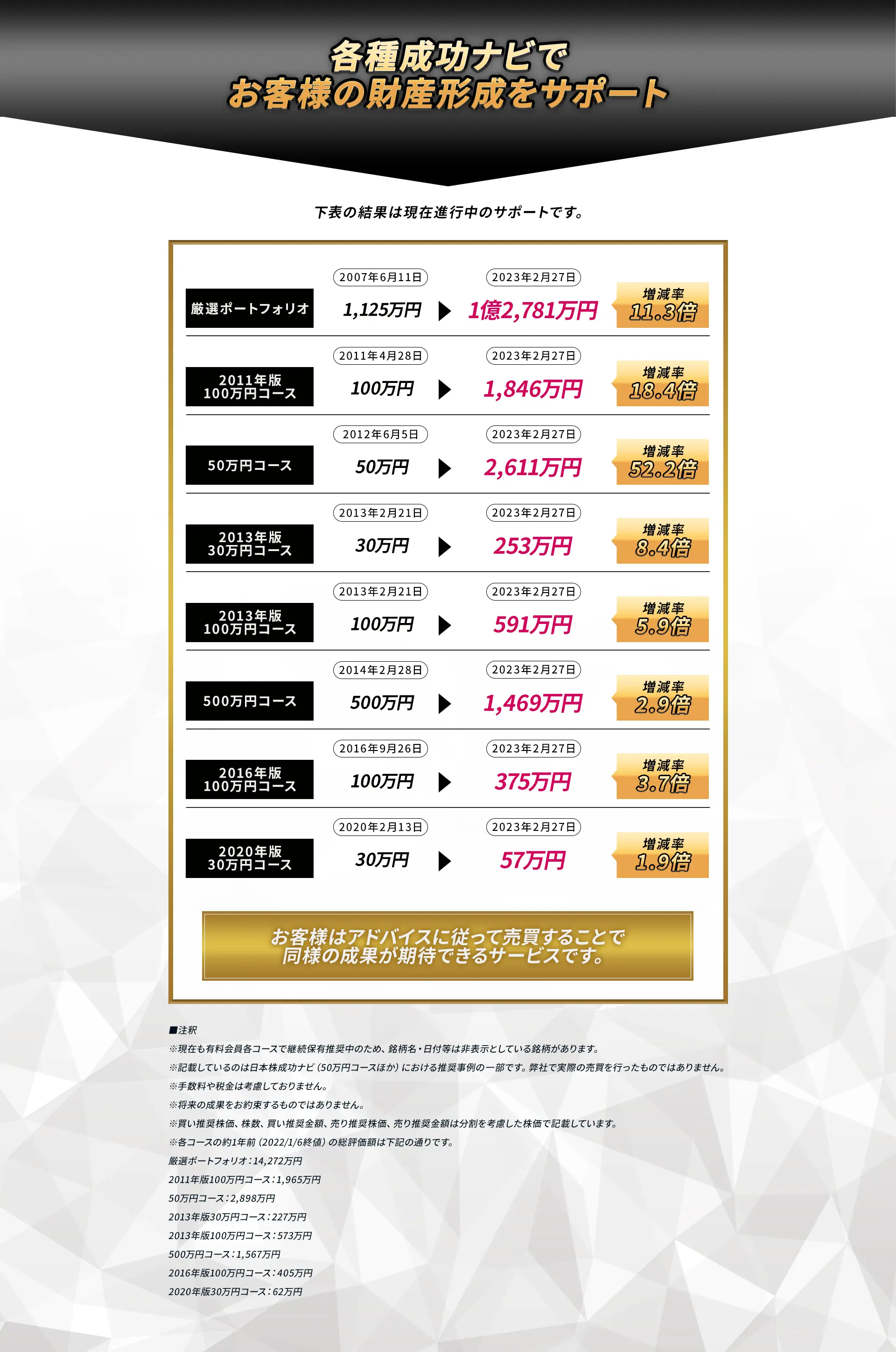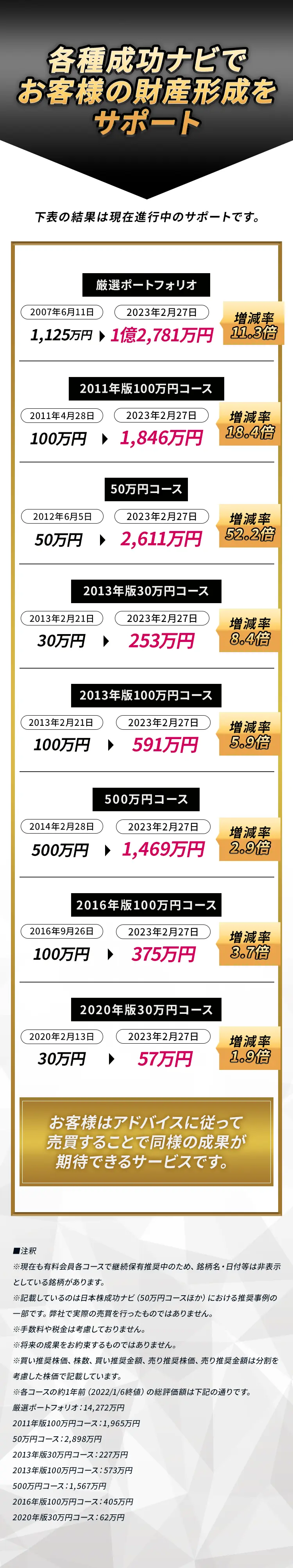 有料情報内容 戦略銘柄レポート、投資戦略レポート、売買サポートレポート、成功ナビデータベースなど。投資金額別にコースを定めて、継続的に個人投資家の資産形成のサポートを提供する成功ナビなどのコンテンツデータベースを提供。コンテンツの提供方法 例えば、日本株基本コース(3ヶ月9,000円)のコンテンツの一つである2020年版30万円コースは2020年1月に30万円の元本で運用をスタートし、30万円の元手を戦略銘柄の売り買いの助言によって、日本株で資産形成が出来るように継続的にサポートを行っていく一連のコンテンツ。ロスカットや大きな値幅取り、現金化、利益確定売りや銘柄入れ替えなどのサポートを継続的に行い、お客様の資産形成を総合的にサポートする各種コンテンツ(戦略銘柄レポートなど)を提供。過去のコンテンツに遡ってコンテンツデータベースを閲覧ができる権利を持て、メール配信もあります。