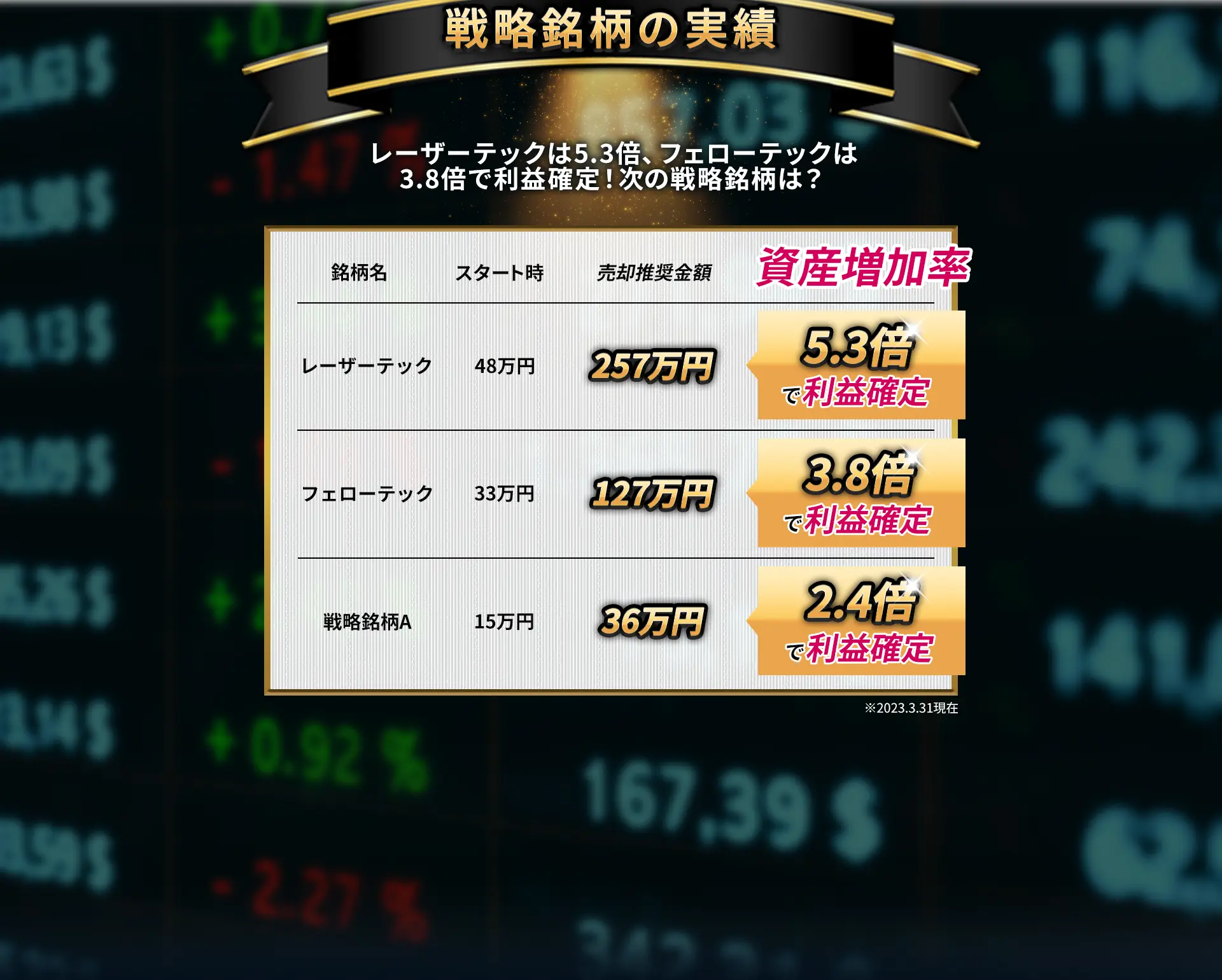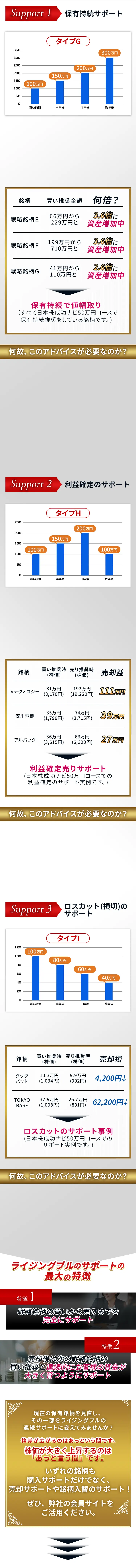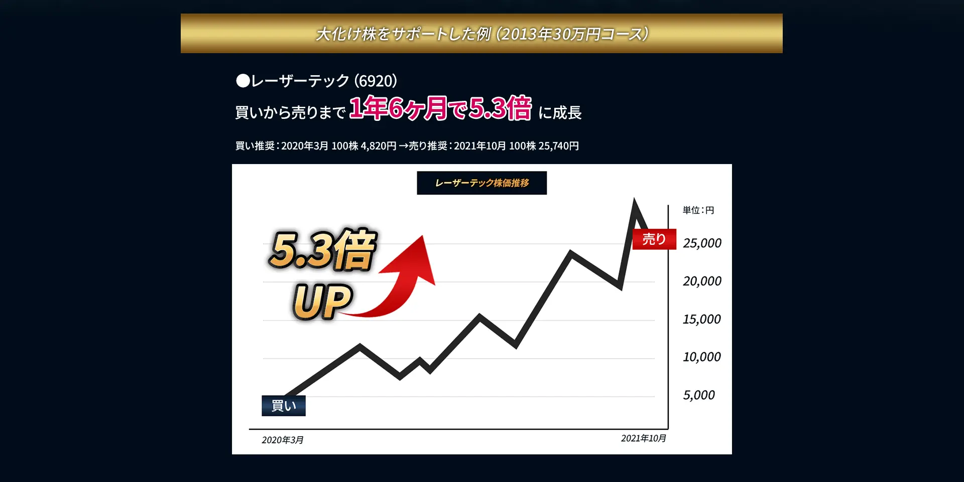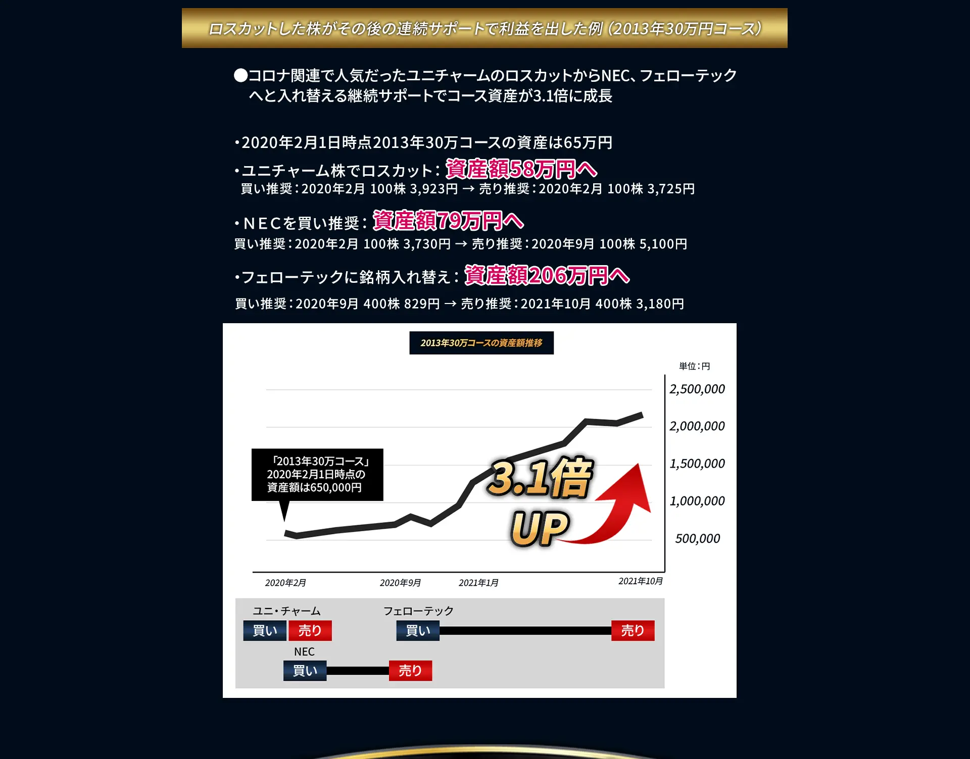 失敗した場合には、迅速な売却で、損失を極力抑えるだけでなく新たな大化け候補銘柄への乗り換えで失敗を成功へと変えていくサポートがされていきます。