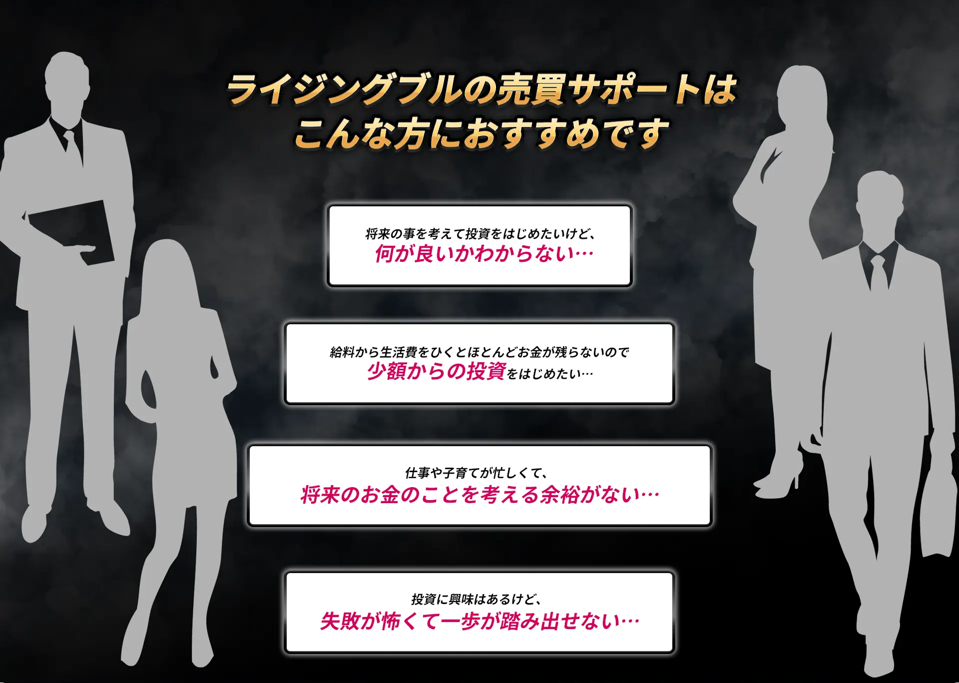 株を少額資金で始めたいと思われる方は、非常に今、増えています。ただし、少額資金をまとまった資金へと育てていくのは難しいのが現実です。ライジングブルの売買サポートは、お客様が少額資金で始めても成功できるように全力でサポートします。