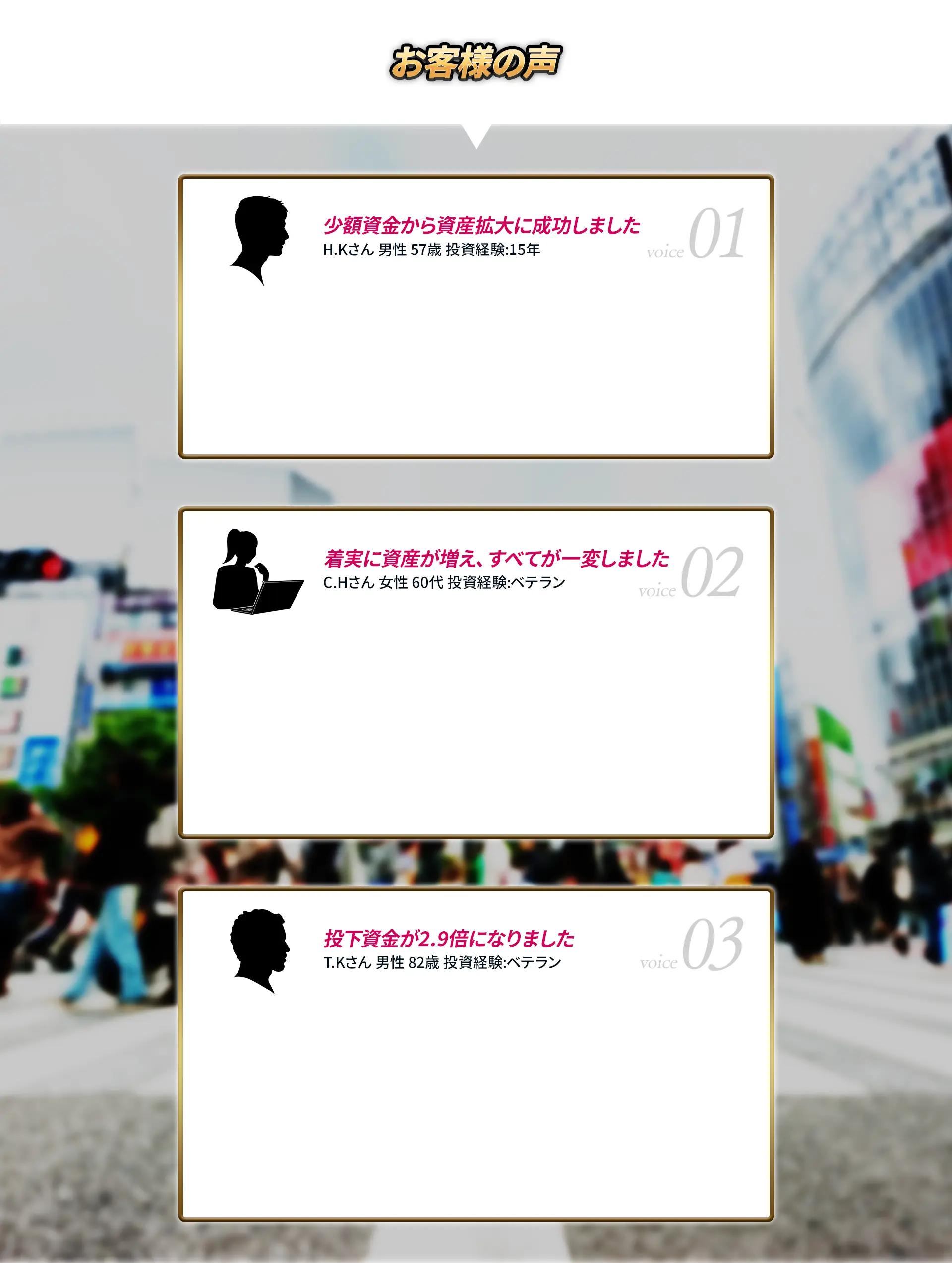 現在60万円で運用したい方、現在150万円で運用したい方、現在300万円で運用したい方は別のコースを設けており、今から始めたい方はどう始めれば良いのかが明確なサービスです。