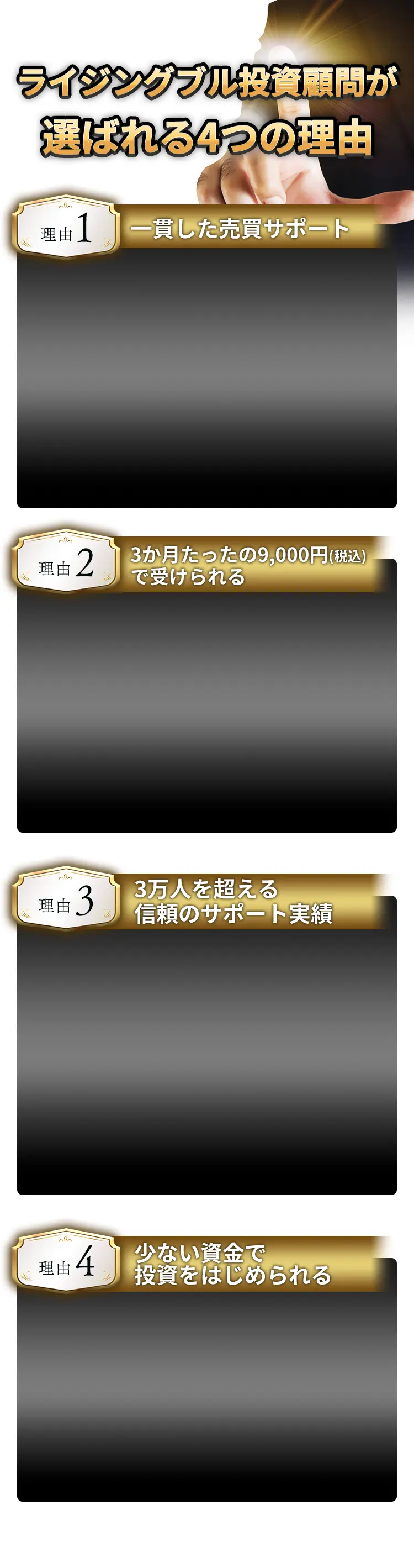 他の投資顧問サービスだと、1銘柄の買い推奨で数万円を取ることも珍しくありません。ライジングブル投資顧問のサポートは1年で数多くの買い推奨銘柄が提供され、それらの買い推奨銘柄はすべて売り推奨、次の戦略銘柄の買いまでたったの3ヶ月9,000円(税込)でサポートします。